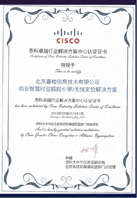 CERTIFICATE OF CISCO INDUSTRY SOLUTION CENTER OF EXCELLENCE